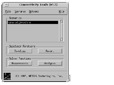 Information in the Connectivity Tools window, shown in Figure 2-4, is updated and the tutorial_baseline scenario is created and its entry displayed and selected in the Scenarios list. The initial baseline scenario created when a baseline is loaded into memory is given the name of the baseline, in this case tutorial_baseline. The initial scenario is used to display the baseline topology, format and display the Diagnostic Report generated by the parser process, and view (not modify) existing router, LAN, link, and End System attribute settings, as well as static route, default network, and routing algorithm information. Using the Connectivity Solver, the initial scenario can also be used to create and view connectivity requirements for a particular baseline. This functionality is not available with the Connectivity Baseliner. Therefore, the Requirements button is not activated.