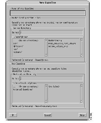 The New Baseline window, shown in Figure 2-2, is displayed. Within this window specify the name of the new baseline, the source directory where the router configuration files are located, and the destination directory where the baseline is to be created.