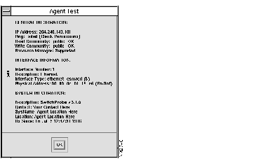Step 2 Click Test. If the agent is operational, the agent and interface information appear in a window (Figure 3-3). If the agent is not operational, the information in the dialog box tells you if the agent can be reached, and if so, whether the read community string, the write community string, or both, has failed.
