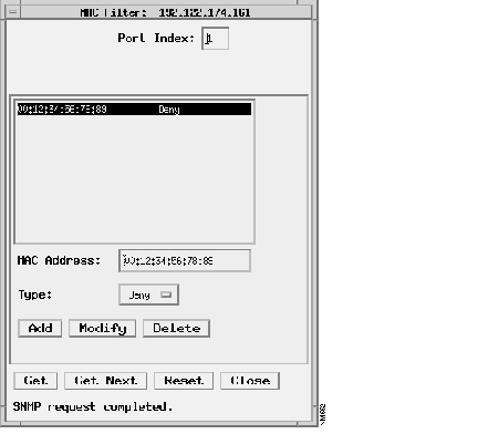 The MAC Filter window, shown in Figure 6, lets you filter packets based on the MAC address and Type defined in this window. You can define upto a maximum of 256 MAC addresses for the entire system.