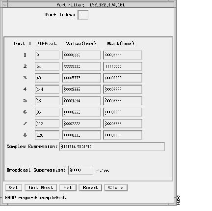 The Port Filter window, shown in Figure 9, lets you filter packets based on the value defined in the Complex Expression and Broadcast Suppression fields of this window. You can define upto a maximum of eight entries per port.