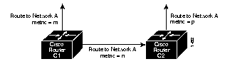 Assume that C1 already has a route to Network A with metric m and has just received an update about Network A from C2. The best metric at C2 is p. The metric that C1 would use through C2 is n.