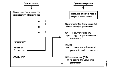 When the KEY code and the (CR) and the type of session have been typed, the operator may access the parameters to be modified.