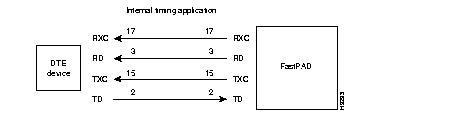 Internal clock applications are normally used when connecting a DTE device to the FastPAD. For internal clocking, the data channel provides two clocks, Transmit Clock (RS-232 equivalent pin 15) is used by the attached device to clock data to the FastPAD, Receive Clock (RS-232 equivalent pin 17) is used by the FastPAD to clock incoming data. When the attached device is a DTE, a straight-through cable is used to connect it to the FastPAD.
