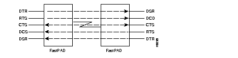 FastPAD data channels are DCE. Five control signals are associated with each data channel. Data Terminal Ready (DTR) and Request To Send (RTS) are both input signals from the attached device. Data Set Ready (DSR), Carrier Detect (CD), and Clear To Send (CTS) are output signals to the attached device. A FastPAD link crosses control signals similar to a crossover cable or null modem.