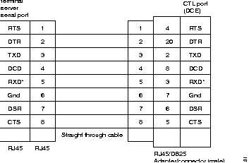 - Connect a terminal with an RS232 cable to port 1 of the annex. (This is a DTE to DTE connection. Therefore, a null modem is required. This can be a combination of a straight RJ45 cable with an RJ45/DB25 modem adapter on the dumb terminal end.)