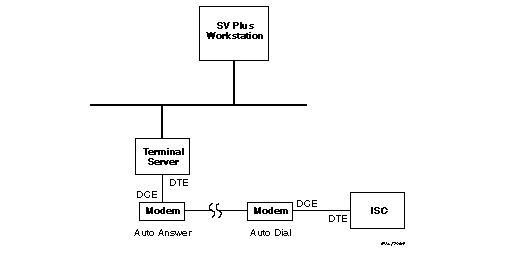 The connection from StrataCom ISC to a StrataView Plus workstation via a terminal server and modem is shown in Figure 2-7.