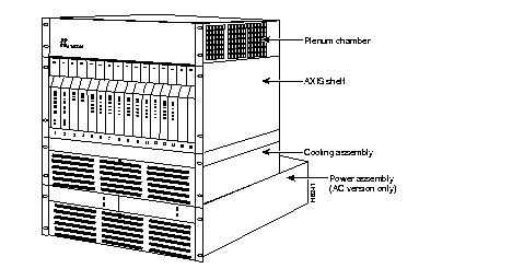 A cooling assembly containing the AXIS cooling fans consists of a rack mounted fan unit below the main AXIS shelf and either a plenum or spacer unit which is mounted above the shelves. The cooling assembly is capable of cooling up to two AXIS shelves in the same rack. In racks that contain more than two shelves, a booster cooling unit is used to provide additional cooling. The cooling assembly is powered from the main AXIS shelf. An external view of a single AXIS shelf configuration is shown in Figure 2-1. The arrangement of assemblies in a rack including cases for multiple AXIS shelves is provided in Chapter 6, 'Installation and Start-up'.