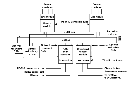 A simplified block diagram of the AXIS hardware is shown in Figure 2-2. As shown by the dashed lines, the ASC, SRM and Cellbus are all 1 for 1 redundant with one ASC, BNM, SRM slot set attached to one Cellbus, and the remaining ASC, BNM, and SRM slot set tied to the other Cellbus.