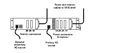 In AC powered systems, a separate AC power assembly is required, see Figure 2-6 and Figure 2-7. This assembly is rack mounted under the shelf cooling assembly in the rack and is available in both a single and double AC source line version. The power assembly has a modular design and can be configured with up to 6 power supply modules, each module providing 875 watts of 48 VDC power. The power assembly can provide power for up to 4 AXIS shelves, requiring 3 power supply modules, or 4 for a (1 for N) redundant power supply configuration. The rear panel has 4 connectors which supply 48 VDC power to the shelves. The first three (1A, 2A and 3A) connectors also provide power monitoring information to the AXIS shelf. Another 3 connectors (1B, 2B, and 3B) on the rear panel provide monitoring information for the second half of the power supply. Special cables are used from the rear of the power assembly to the rear of the shelves to feed power and monitor data to the shelves.