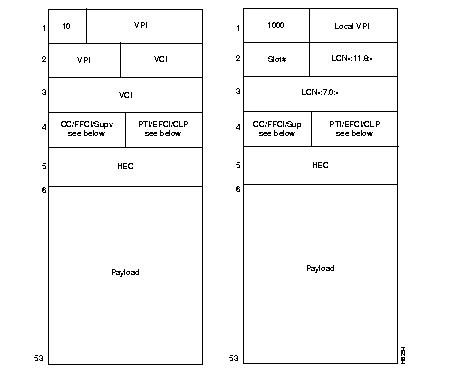 AXIS implements the ATM STI cell format by using slot/channel numbers in the VPI/VCI fields in the cell format used between the BNM and the BPX BNI port. The cell format is shown in Figure 2-13 and Figure 2-14. The format on the left is the general STI format, the format on the right is the AXIS implementation.