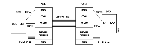 The IMATM accepts trunk signals from the BPX BNI over a single T3 or E3 connection and inverse multiplexes them over multiple T1 or E1 lines. The other end of the inversed multiplexed trunk is another IMATM card in a remote AXIS shelf (see Figure 4-2).