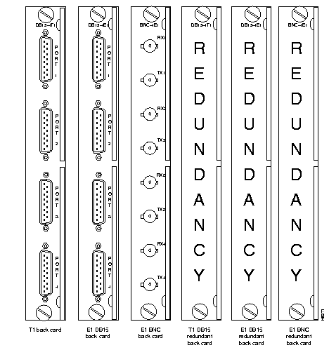 When the SRM is used to provide 1:N redundancy for T1/E1 service modules, the standby (redundant) card set uses a special redundancy backcard. There are three types of redundancy backcards; R-DB15-4T1, R-DB15-4E1, and R-BNC-4E1 depending upon the line type (T1 or E1) and the E1 connector type (DB-15 or BNC). When 1:N redundancy is invoked, the physical lines to failed service module backcard are still used but the signals are routed to and from the redundancy backcard.