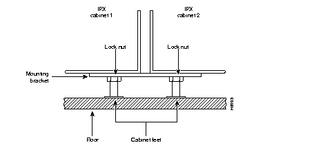 The bottom mounting bracket, shown in Figure 2-5, uses the cabinet feet and the securing nuts to attach the two cabinets together at the bottom.