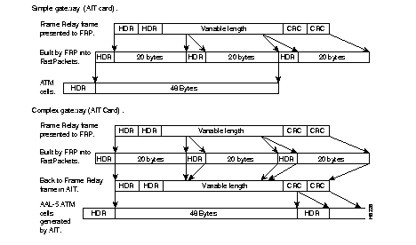Starting with Release 8.1, with the Complex Gateway capability, the FRSM card in the AXIS, the AIT card in the IPX (or BTM card in the IGX) streams the frame relay data into ATM cells, cell after cell, until the frame has been completely transmitted. Since only the data from the FastPacket is loaded, the Complex Gateway is an efficient mechanism. Also, discard eligibility information carried by the frame relay bit is mapped to the ATM cell CLP bit, and vice versa. See Chapter 14 for further information on frame relay to ATM interworking. A comparison of the simple gateway and complex gateway formats is shown in Figure 7-11.