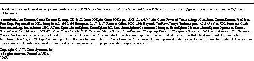 You can access Cisco documentation on the World Wide Web at http://www.cisco.com, http://www-china.cisco.com, or http://www-europe.cisco.com. The following list of documentation is provided as a quick reference: