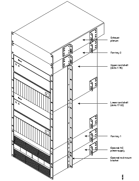 The IGX 16 rack-mount system is mounted in a standard 19" rack, such as a STRATM cabinet. This installation uses standard EIA spacing between vertical rails. Also, the vertical spacing between components, such as the card cage and fan tray, must be in the range .047" to .077" (0.119 cm to 0.196 cm).