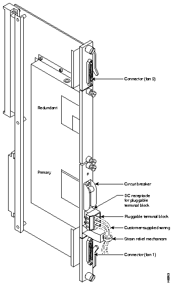 A PEM is a small card that plugs into a connector on the PE-BC. (The PEM plugs into the same connector as a cable from the power supply module in an AC-powered system.) A PEM takes the DC power directly from the DC power source in the building, filters it, and passes it to the PE-BC. A PEM also has a circuit breaker and a strain-relief clamp for the DC power cable. Figure 2-12 shows a PEM plugged into a PE-BC in a non-redundant system. It also shows the blank plate that covers an unused connection in a non-redundant system. Redundancy of DC sources and PEMs lets the system continue to operate in case one of the two independent DC branch circuits fails. The Cisco StrataCom IGX Installation publication describes the DC power setup.