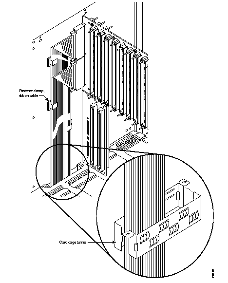 In an IGX 32, a pair of ribbon cables carries the backplane signals between the upper and lower shelves. These ribbon cables pass through a cut-out space in the card cages. They also go through a two-piece conduit that fits together to surround the cables. The name of this two-piece conduit is the card cage tunnel. The cables connect to two, 100-pin connectors that reside on the front side of the backplane (the opposite side of the backplane from the Power Entry Back Card). Figure 2-25 illustrates the expansion connectors, the ribbon cables, the cutout space, and the card cage tunnel. The card cage tunnel is shown in place in the main figure and prior to insertion in the blown-up view.