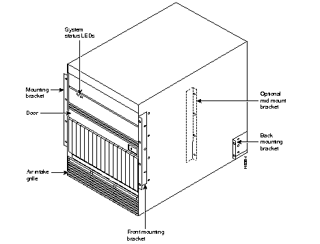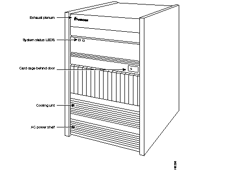 The stand-alone enclosure holds all of the system modules, power modules, power supplies, and cooling fans. The IGX 8 cabinet contains one eight-slot card cage with a backplane into which front cards plug, three auxiliary slots, a fan tray with four fans, an exhaust plenum, a power entry module, and an optional AC Power Tray that holds up to four power supplies. Figure 2-3 is a front view of the IGX 8 stand-alone.