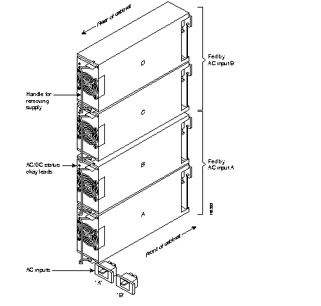 The minimum requirement for an AC-powered system is one AC source and one power supply. One supply is adequate for four cards unless you specify power supply redundancy. See Table 2-1 for power supply requirements. Figure 2-14 shows the power supply slot designations and exterior.