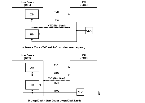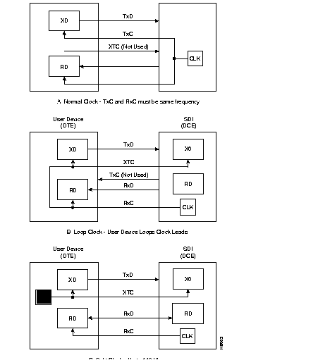 Three clocking modes are available on the SDI for clocking in transmit data and clocking out receive data. In addition, the SDI can operate as either a DCE or DTE, which makes possible six combinations of clocking. (See Figure 4-35 and Figure 4-36 .) With loop clocking, the user device must loop the RxC to the XTC for clocking out the transmit data.