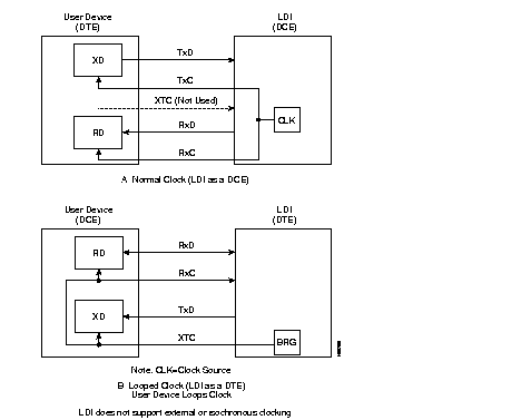 The LDI supports two clocking modes: normal and looped (Figure 4-39). The normal mode is used when the LDI port is configured as a DCE. Looped clock is only used when the LDI port is configured as a DTE. The user device must take the external transmit clock and loop it back to the RxC for clocking in the receive-data. In both cases, the LDI is the source of clock timing. Table 4-40 shows the accuracy and worst case jitter that can be expected from an end-to-end circuit using LDIs at each end.