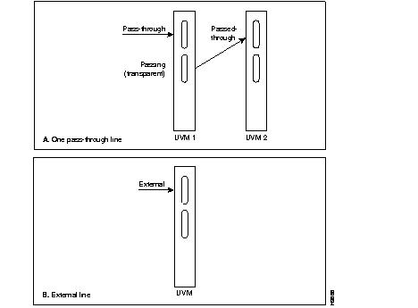 The UVM can support mixed connection types. For example, you can add 12 connections that use ADPCM and 6 that use LDCELP. Any combination is possible as long as the configuration does not exceed the capacity of the card. If the number and types of connections exceeds the capacity of the UVM, a second UVM is necessary to take the excessive channels. The name of this approach is pass-through. In this scheme, a primary UVM connects through a cable to a secondary UVM. The primary passes the unprocessed channels to the secondary UVM. The primary application of pass-through is to LDCELP.