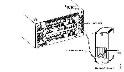 Step 1 Connect the terminal (see Figure 3-6) using the thin, flat, RJ-45-to-RJ-45 rollover cable (it looks like a telephone cable) and an RJ-45-to-DB-9 or RJ-45-to-DB-25 adapter (labeled "Terminal") included with the ERM. For cable pinouts, see the appendix "Cable Specifications."