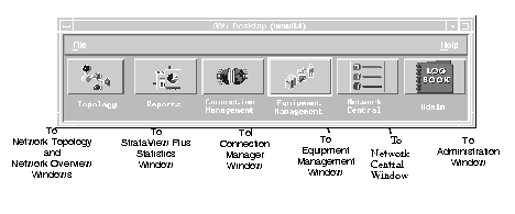 Presentation of the StrataView Plus Desktop dialog window provides access to the principle NMS applications. Buttons on the SV+ Desktop launch the toolsets you need for specific network management, monitoring, and administration tasks. Use the SV+ Desktop menu bar to either exit the window or access help.