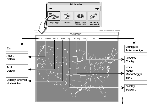 The following sections provide information on working with the topology display pulldown menu functions. The descriptions that follow are presented in order as you look at the pulldown menus from left to right in the Network Topology window.