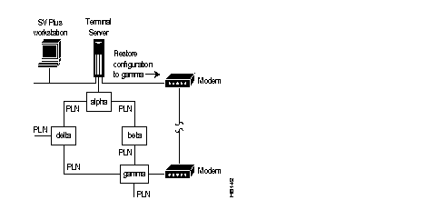 The following illustration shows an example of node configuration restoration to "gamma" which has been put out of service. A major alarm is generated over the network because gamma is unreachable. The trunks going from "gamma" to other nodes should not be deleted, so as to preserve the configuration information about gamma at these other nodes.