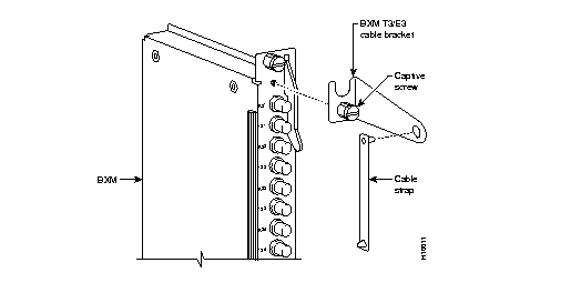 Attach the BXM T3/E3 cable bracket to each BXM T3/E3 card as follows, Figure 8-5: