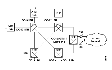 A BXM card set, using Application Specific Integrated Circuit (ASIC) technology, provides high speed ATM connectivity, flexibility, and scalability. The card set is comprised of a front card that provides the processing, management, and switching of ATM traffic and of a back card that provides the physical interface for the card set. An example of a BPX network provisioned with BXM-622 cards is shown in Figure 6-1.