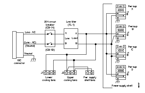 Figure 2-14 shows the wiring of the AC PDU. This PDU is installed in all cabinets configured for AC operation. To support power connections in a variety of countries, six different power cords are available for the IEC connector.