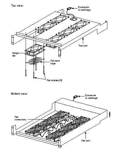 To remove a fan from the lower cooling unit, Figure 4-8 and Figure 4-9, perform the following steps:
