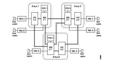 In Figure 4-5, each VNS has two IGXes in its area. VNS 1 has IGX 1-1 and IGX 1-2, and VNS 2 has IGX 2-1 and IGX 2-2, and so on. Each IGX is connected to one PBX with its complement of end users. So in Area 1, VNS 1 would be responsible for processing call setups for all calls from PBX A and PBX B. It would also handle calls destined for PBX A and PBX B. Similarly, VNS 2 would be responsible call setups for PBX C and PBX D, and VNS 3 would be responsible for PBX E and PBX F.
