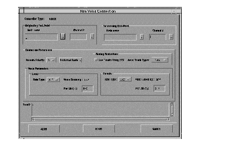 The New Data Connection Window layout is consistent with the existing connection windows. The remote and local end points contain Node Name and Port Number Fields. No DLCI or VPI/VCI fields are required for voice connection.