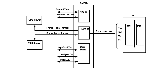 The FastPAD, in conjunction with the IPX, provides frame relay connections of CPE (routers, bridges, packet switches, etc.) via PVCs. The CPE is connected to the FRAM-01 card that supports Frame Relay. The FTI back card (V.35, X.21, T1, or E1) performs the adapter layer function to convert between the FastPAD special frame format and FastPackets.