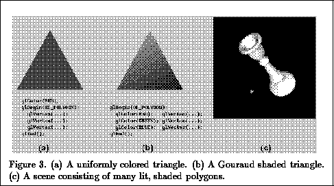 glBegin(GL_POLYGON); glVertex3i(0,0,0); glVertex3i(0,1,0); glVertex3i(1,0,1); glEnd();The ten geometric objects that are drawn this way are summarized in Table 4.1. This particular group of objects was selected because each object's geometry is specified by a simple list of vertices, because each admits an efficient rendering algorithm, and because it was determined that taken together these objects satisfy the needs of nearly all graphics applications.