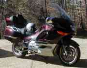 ![]() | At the turn of the century, 9 years and 30,000 great miles later, the Suzi and I parted ways. As is frequently the case with love affairs the romance ends and the man is lured away by a younger more nubile chassis. My temptation was the BMW K1200LT. BMW claims that they produce the "ultimate driving machine" and I can vouch for their claim. One year and 12,000 miles later I am still in love with this bike. Patty says it better not end because it is my last motorcycle. Well it may be my first and last brand new motorcycle. I'm only in my 50's and you don't quit riding because you get old, you get old because you quit riding. I still haven't owned a Harley. | |