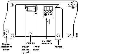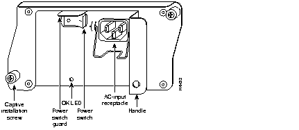 A handle on the AC and DC power supplies provides a grip point for removing and replacing the power supply. (Figure 1-11 shows the faceplate of the AC-input power supply. Figure 1-12 shows the faceplate of the DC-input power supply.) Two captive installation screws secure the power supply to the chassis and seat the power supply in the router midplane. A Power OK LED indicates that the power supply is delivering +5 VDC to the router midplane.