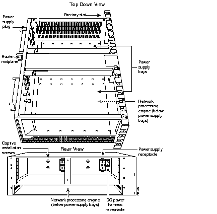 The I/O controller, port adapters, power supplies, and network processing engine slide into their respective chassis slots and connect directly to the router's midplane; there are no internal cables to connect. The midplane distributes DC power from the power supplies to the I/O controller, port adapters, fan tray, and network processing engine.