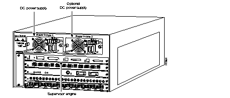 Figure 8-1 shows a rear view of the Catalyst 5000 5-slot chassis with AC-input power supplies installed, and Figure 8-2 shows a rear view with DC-input power supplies installed.