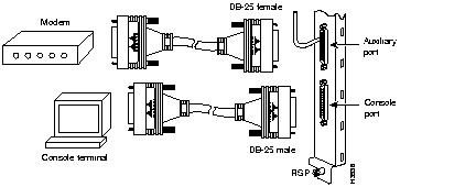 Two asynchronous serial ports on the RSP4, labeled Console and Auxiliary, allow you to connect external terminal devices to monitor and manage the system. The console port is an Electronics Industries Association/Telecommunications Industry Association (EIA/TIA)-232 receptacle (female) that provides a data circuit-terminating equipment (DCE) interface for connecting a console terminal.